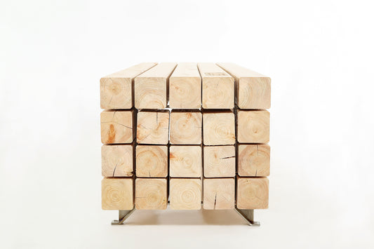 普通は建材として利用しにくい小径木を使用するため、節が多く、芯持ち芯去り問わずに利用します。木に優しいバイオ乾燥で乾燥させた角材ベンチです。